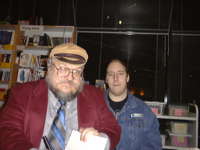 This is at a book signing. The guy in the picture is George R R Martin, one of my favorite authors, who is writing the excellent Songs of Fire and Ice series. If you like high fantasy, I suggest picking up the first book, A Game of Thrones.